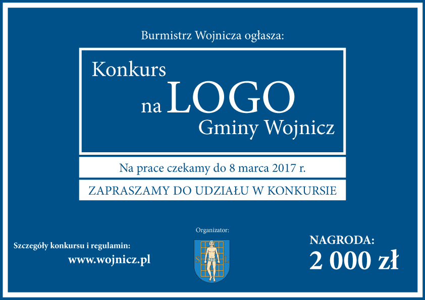 Burmistrz Wojnicza ogłasza konkurs na opracowanie logotypu gminy Wojnicz. Celem konkursu jest stworzenie znaku identyfikacji wizualnej, którym samorząd będzie się posługiwał w materiałach promocyjnych, informacyjnych. Dla autora najlepszej pracy przewidziana jest nagroda w wysokości 2000 zł.